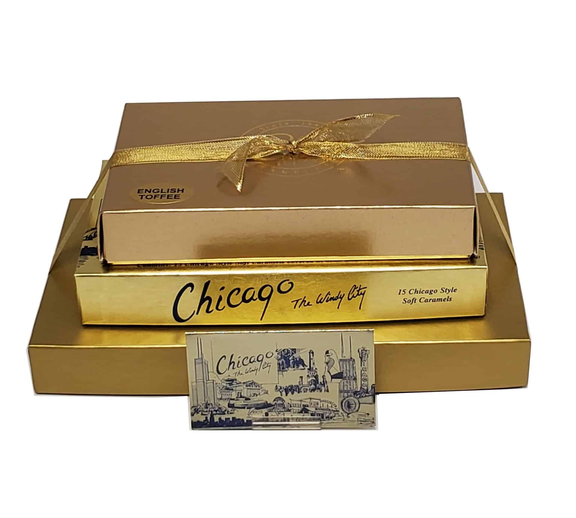 Looking for a real Chicago Hometown Classic? It’s right here in this gift tier that combines three of our most popular boxed Chicago The Windy City chocolates including English Toffee, Caramel Nut Paws and Milk Chocolate Vanilla Caramels topped with Sea Salt.