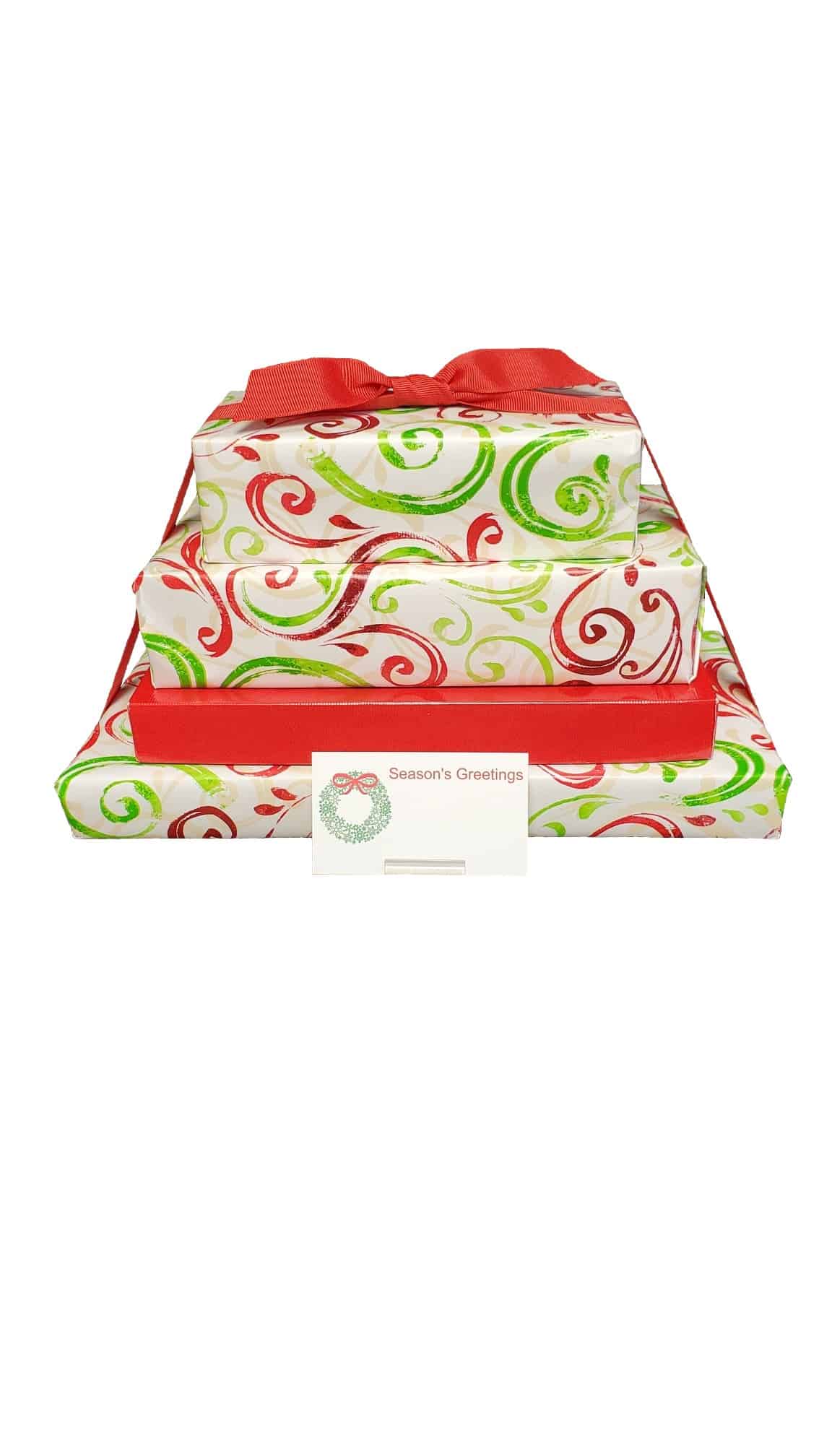 We start with the Ultimate Sampler at the bottom then top that with a 6 piece box of Caramel Nut Paws, a One pound box of Milk Chocolate English Toffee and finish with a half pound box of Fudge Squares at the top, securing it together with a festive grosgrain ribbon for the holiday season.